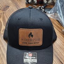 This is the popular Richardson 112 snap-back Trucker hat in Black on Black with a brown leather logo patch.